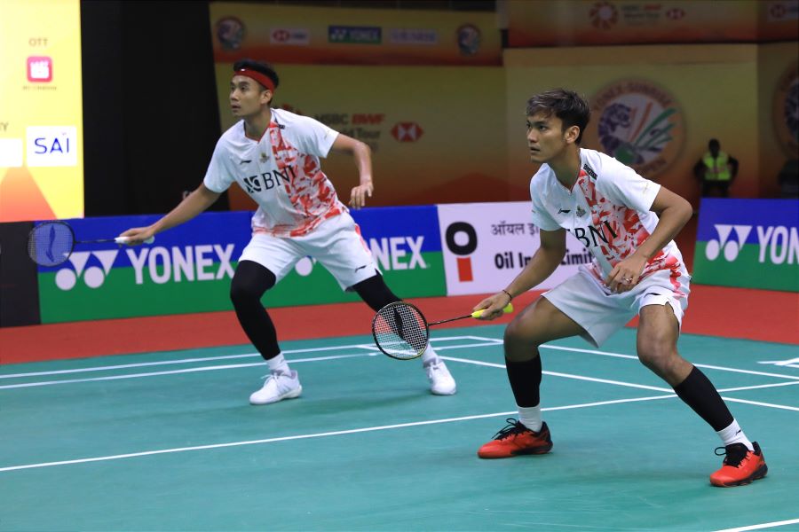 Bagas/Fikri lakukan selebrasi usai sukses kalahkan Leo/Daniel di semifinal Orleans Masters 2023.https://bit.ly/3MtS4WF
