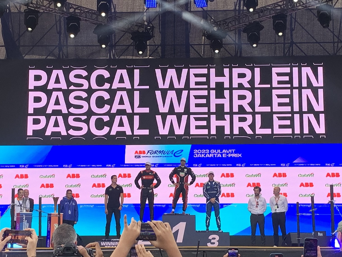 Momen Pascal Wehrlein Dielu-elukan Penonton saat Berada di Podium Usai Menangkan Race 1 Formula E Jakarta 2023.
